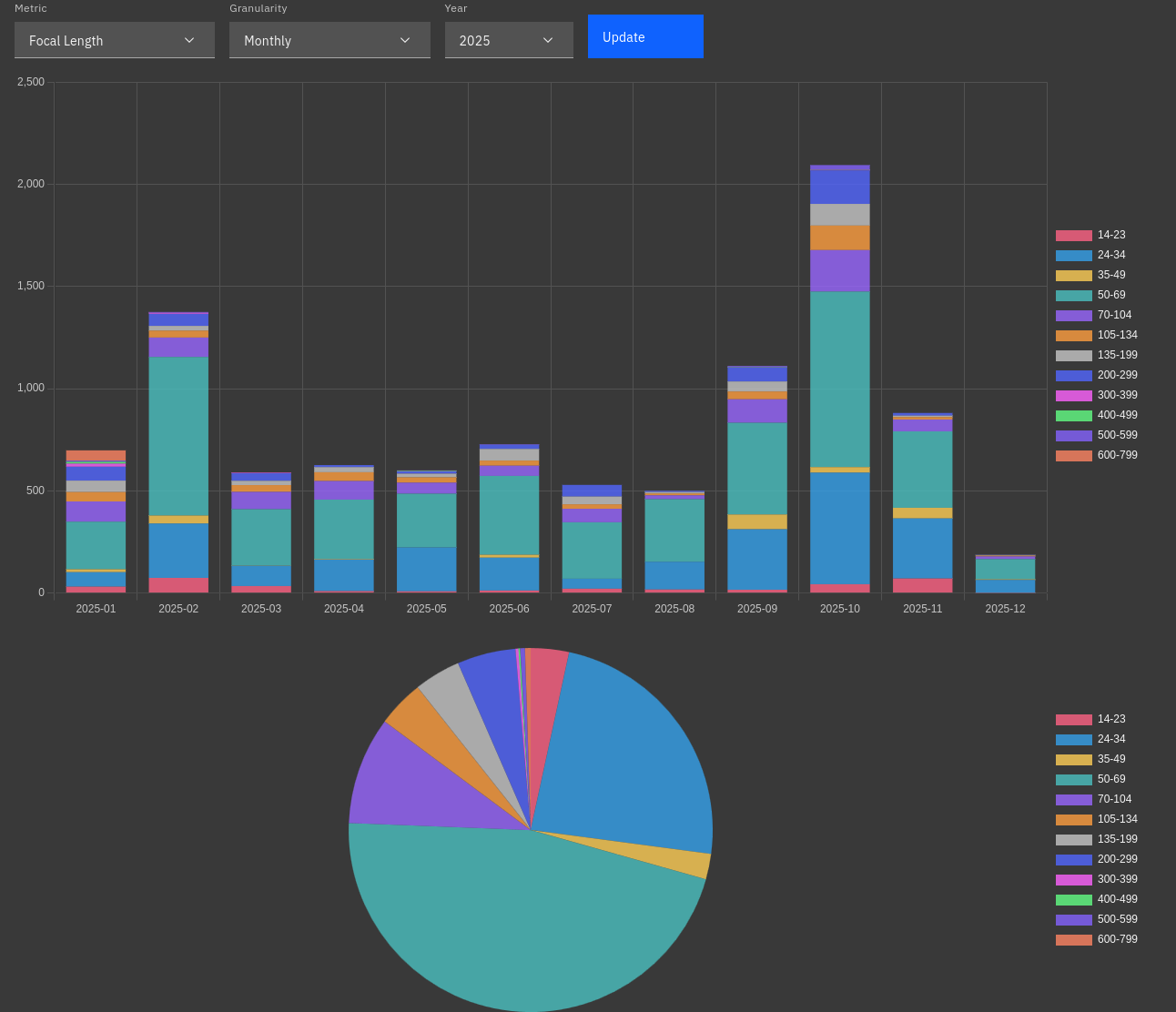F 28/1.4を買ったことにより、広角まわりに変動がありましたが、ざっくり50単が半分、望遠が1/4、広角が1/4という比率で推移しています。旅行単体だと結構差があるんですが、年で均すとそんなもんですね。2024年もデータ見てみたんですが殆ど同じなので変動なしです。