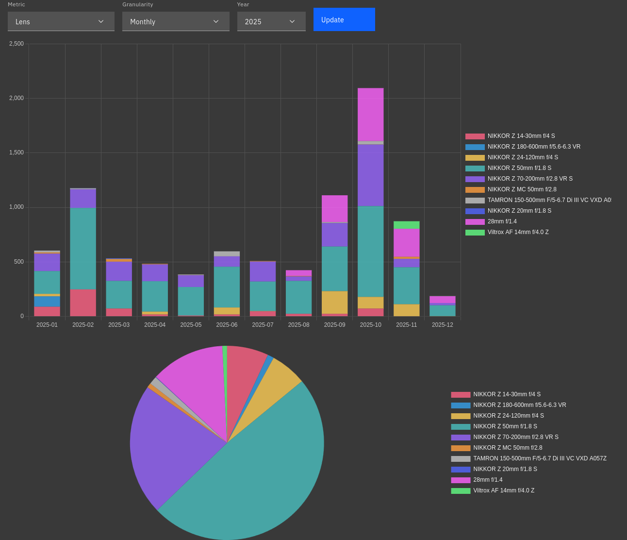 昔はちゃんとやっていたレンズ使用統計、ここ最近は動きが少ないのもあってツール動かすのだりーとなっていたんですが、作り直して簡単に見れるようになったので今年はやるぞ!となって書いてます。