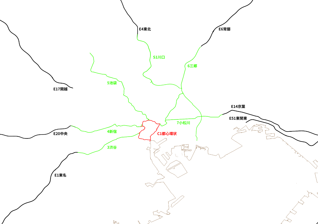 東京の高速道路は原則として放射線状の道路と環状線の2つから成り立っており、最も内側にある環状線がC1都心環状線です。つまり東名高速、東北道、関越道など、全ての道はC1都心環状に通じているわけです。簡単ですね…と言えればよかったけど、これは原則論であり、実際は多数の例外があります。